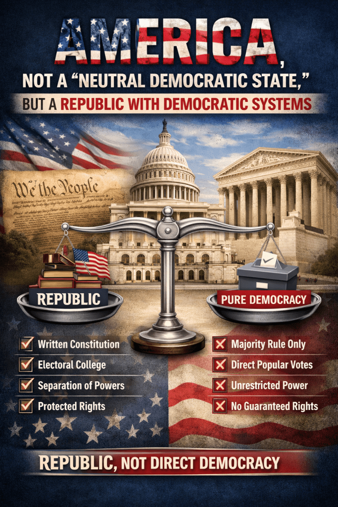 America was not created as a system of pure, direct democracy. It was designed as a republic that incorporates democratic mechanisms within a system of checks and balances and protections against majority excess.